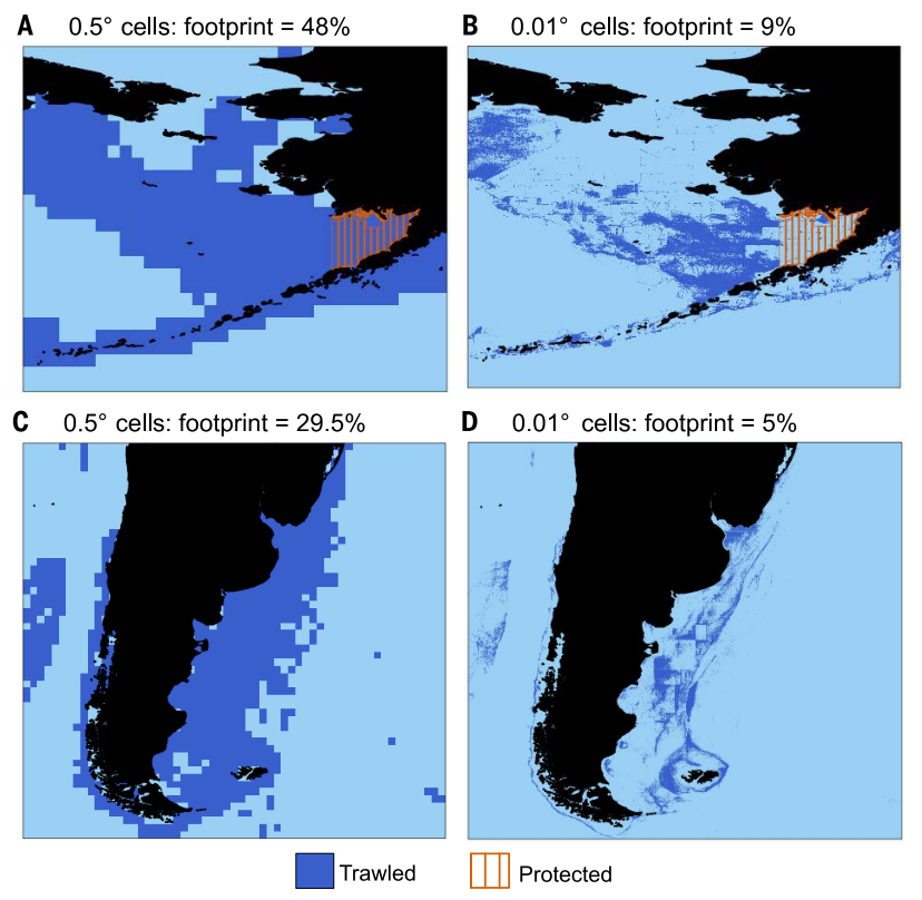 This paper is a scientific critique of a widely cited study that claimed fishing occurs over more than half of the global ocean. The authors show that this conclusion is largely an artefact of using very coarse spatial resolution, where any fishing activity within a large grid cell causes the entire area to be counted as “fished.” By re-analysing the same Global Fishing Watch data at much higher spatial resolution, they demonstrate that estimated fishing footprints shrink dramatically—by more than a factor of ten globally and more than five for trawl fisheries. The comment also explains that comparisons between fishing and agriculture footprints were misleading, because agriculture was assessed at much finer resolution and accounted only for directly used land. Overall, the paper concludes that low-resolution mapping greatly exaggerates the spatial footprint of fisheries, and that high-resolution analyses are essential for realistic assessments of fishing impacts and for informed marine policy debates.